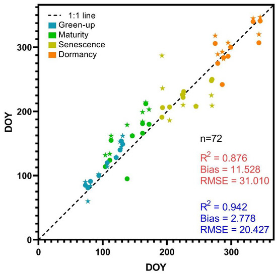 In this study, in situ phenology was also used to evaluate the accuracy of phenology data extracted from remote-sensing images. To explore the impact of data normalization on the accuracy of phenology extraction, we compared the two sets of transition dates based on different data in Figure 11 with the results of the in situ measurements. As shown in Figure 12, the R2 improved by 7.5%, the bias decreased by 8.75 days, and the RMSE decreased by 9.58 days. Therefore, with the input of harmonized high-spatial-resolution data, the accuracy of vegetation monitoring was improved.