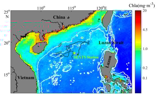 Spatial distribution of surface chlorophyll-a concentration (mg m−3) in winter in the northern SCS. The background color shows the climatological Chla averaged in winter from 1998 to 2010. The white curve is the isobath of 200 m and 2000 m, respectively. The yellow pentacle shows the position of SEATS station. The red point shows the starting point of the float, and the gray curve shows the trajectory of the float.