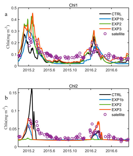 Comparison of chlorophyll-a concentrations (mg m−3) of pico-phytoplankton ((a) Chl1) and diatom ((b) Chl2) in the optimization period.