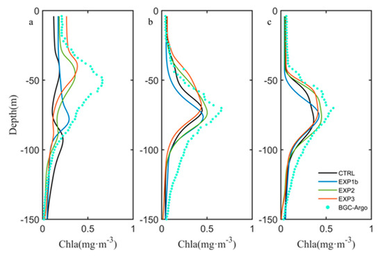 Comparison of vertical monthly chlorophyll-a concentrations averaged in March (a), June (b), and November (c) 2015. Colored solid lines represent different experiments (CTRL, EXP1b, EXP2, and EXP3). Dotted lines represent the BGC-Argo observation.