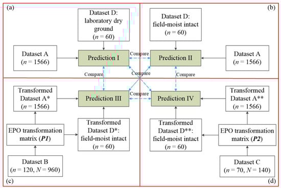 Prediction I (Figure 2a): Dataset A (dry ground soils) was applied to build estimation models, which were then tested on the dry ground spectra in Dataset D. This prediction was used as a benchmark to compare with the three other predictions.
