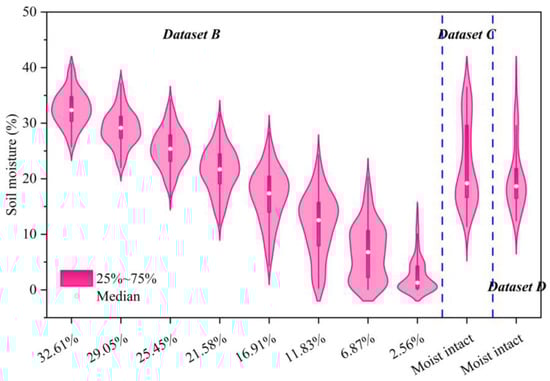 In Dataset B, the average soil moisture contents at the eight moisture levels were 32.61%, 29.05%, 25.45%, 21.58%, 16.91%, 11.83%, 6.87%, and 2.56% (Figure 3). In Dataset C, for the field-moist intact samples, the soil moisture content varied from 11.43% to 36.48%, with a mean value of 22.51% (Figure 3). Soil moisture of field-moist intact samples in Dataset D ranged from 12.44% to 39%, which was the same as that in Dataset C. Overall, the rewetting experiment obtained a large range of soil moisture contents from 0% to 40.71%, completely covering a range of soil moisture contents of the field-moist intact samples in Dataset D.