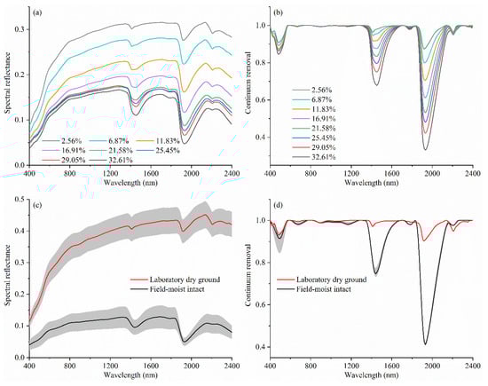 Average spectral and continuum removal (CR) reflectance: (a) mean reflectance spectra at different moisture levels (Dataset B, n = 120); (b) mean CR spectra at different moisture levels (Dataset B, n = 120); (c) mean reflectance spectra collected under laboratory dry ground and field-moist intact conditions (Dataset C, n = 70); and (d) mean CR spectra collected under laboratory dry ground and field-moist intact conditions (Dataset C, n = 70). The shaded areas in the lower subplots denote spectral standard deviations.