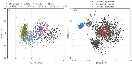 The PCA was performed on the spectral data from Dataset B (Figure 5a), Dataset A, and Dataset C (Figure 5b). For Dataset B (Figure 5a), PC1 and PC2 explained more than 99% of the spectral variability. As soil moisture increased, the PC scatter points varied from right to left. The samples with moisture content ranging from dry ground to 11.83% could be easily discriminated, whereas the PC scores were mixed from 16.91% to 32.61% and could not be clearly distinguished. This phenomenon is consistent with that in Figure 4a. Adding water changes the physical structure and the color of the soils, further explaining the low sensitivity of spectral response to high moisture content [,]. For Dataset A and Dataset C (Figure 5b), the first two PCs accounted for more than 95% of the spectral variability. The first two PCs of the dry ground spectra in Dataset C overlapped with those of the spectra in Dataset A, thereby showing the spectral similarity between these two sets of spectra. However, overlapping was almost not observed between the moist intact spectra in Dataset C and Dataset A because of the influence of the field external factors on the reflectance spectra, and the moist intact spectra in Dataset C were distributed in a separate feature space from the Dataset A spectra.