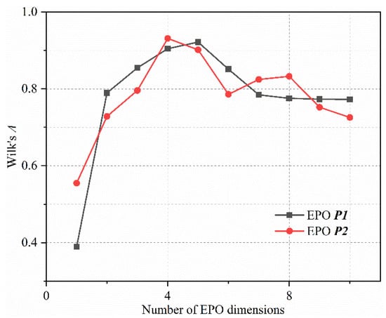 EPO data analysis was conducted in the R statistical environment []. During EPO development, the number of dimensions g, which is an important parameter, should be determined in the EPO. g was calculated on the basis of Wilk’s Λ method [,] defined as follows: