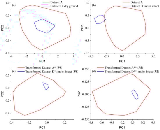 Score plots for the first and second principal components: (a) Dataset A and dry ground samples in Dataset D. (b) Dataset A and field-moist intact samples in Dataset D. (c) Dataset A* and field-moist intact Dataset C* corrected by P1. (d) Dataset A** and field-moist intact Dataset C** corrected by P2. Lines indicate the convex hulls of each dataset.