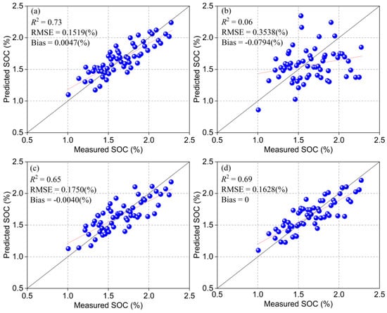 Figure 8 illustrates how EPO improved the prediction accuracy of the moist samples. In predicting the laboratory dry spectra (Figure 8a), the prediction R2 was 0.73, indicating a strong correlation between the measured and predicted SOC values. However, without EPO (Dataset A applied directly to moist intact spectra), the prediction was poor as indicated by the large RMSE value of 0.3538% (Figure 8b). Most of the sample points were either overestimated or underestimated, and the regression line deviated from the 1:1 line. For the moist spectra corrected by EPO algorithms (Figure 8c,d), EPO reduced RMSE values compared with the prediction of the moist intact spectra without correction, and most scatter points were distributed well around the 1:1 lines.