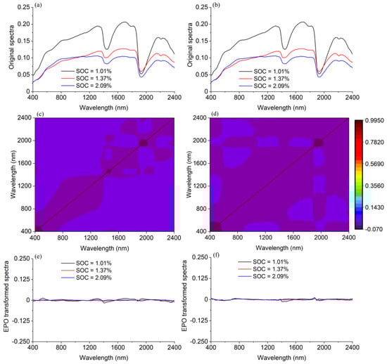 - The EPO correction did not significantly affect the distribution of the important waveband of SOC. The important wavelengths for SOC estimation were mainly located within 400–800, 1380–1440, 1830–1950, and 2090–2400 nm.