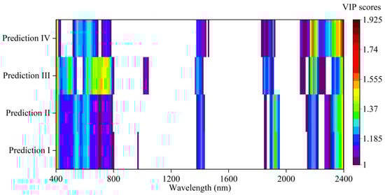 The PLS can effectively deal with data multi-collinearity and cases in which the number of spectral variables exceeds the number of samples [,,]. It can be considered as a combination of correlation analysis, PCA, and regression analysis. PLS is a linear method based on the projection of predictive variables and response variables in a group of latent factors and corresponding scores, and it is the most commonly used model for predicting soil properties from spectral data [,,]. Unlike some nonlinear methods, PLS models are less computationally intensive and more interpretable []. The determination of important wavelengths in the PLS model can be obtained on the basis of the variable importance in projection (VIP) []. If a VIP score at a specific wavelength is greater than 1, then it indicates that this wavelength is necessary to estimate SOC []. In the present research, the optimal number of latent variables was selected through leave-one-out cross-validation, and PLS was implemented in R with the pls package [].