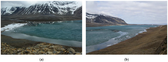 Svalbard’s high-latitude location and its position at the end of the northern branch of the Gulf Stream (the West Spitsbergen Current) make it an ideal place to study changes in lake ice phenology in the High Arctic. The Svalbard archipelago and the adjacent Northern Barents Sea is one of the regions in the arctic that has experienced the greatest warming, with mean annual surface temperature increase of 3 to 5 °C over the past few decades [43]. The warm northward-flowing West Spitsbergen current, an extension of the North Atlantic Current and Gulf Stream, along with associated air masses, contribute to the Atlantic High Arctic maritime climate of the archipelago [44]. The recent intensified Atlantification of the Northern Barents Sea and the intrusion of warm Atlantic waters into the western fjords of Svalbard in recent decades [45] have caused far-reaching environmental impacts in both marine and terrestrial systems. Sea ice has become less extensive around Svalbard, and winter ice has not appeared in the west coast fjords since 2006 [46]. On land, the recent warming has accelerated glacier thinning and retreat [47,48], warming of permafrost [49], and lengthening of the annual hydrological cycle [50]. Warming temperatures, especially during the freezing season, and the shifting seasonality of temperature and precipitation have also been observed in Spitsbergen [51,52].