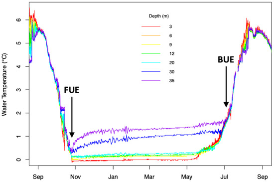Example time series of lake water temperature measured at different depths from September 2009 to September 2010. During the summer period of open water (typically July–October/November), the lake is typically well-mixed, and the water temperature does not vary much with depth. However, once ice appears on the lake, it stratifies until the ice disappears, with colder temperatures near the surface and warmer temperatures near the bottom. The appearance (FUE) and disappearance (BUE) of ice is indicated with arrows.