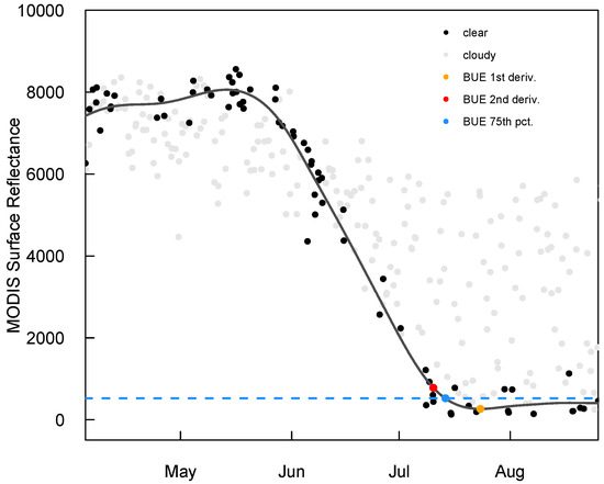 We tested three automated methods (described below) to identify BUE from the smoothing spline fit to cloud-free, lake-wide mean surface reflectance (i.e., a smoothed, gap-filled representation of the time series). These included (1) identifying the first date at the bottom of the downward trend in the smoothing spline, where the first derivative was equal to zero (i.e., first location where the spline leveled out in the early summer; hereafter the “MODIS dSR” method); and (2) the date nearest to the bottom of the spline trend where the second derivative was equal to zero (i.e., point of maximum curvature; hereafter the “MODIS d2SR” method). Additionally, we found (3) the earliest date in each year where the smoothing spline crossed below a reflectance threshold, calculated as the third quartile (i.e., 75th percentile) of the clear sky MODIS surface reflectance values during the summer (20 July–31 August) of the given year (hereafter, the “MODIS Summer Q3” method). The mid-July through August period was chosen as it was a consistent annual period of open water on the lake, before some high surface reflectance values in the fall (presumably due to sun angle dynamics).