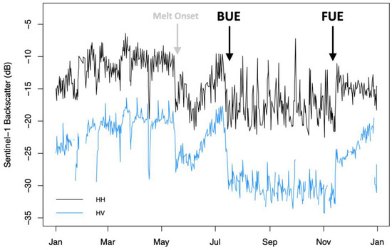 Example time series of lake-wide average Sentinel-1 backscatter from 2015. The black line shows the backscatter at HH polarization, while the blue line is for HV polarization. The sharp drop in backscatter in mid-May indicates the onset of melting of the snow and ice on the lake (melt onset), while the sharp drop in early July marks the disappearance of ice (BUE). In this particular year, a sharp increase in backscatter was observed in early November, which also marks a change in the variability of the backscatter time series. This is taken to be the date at which the lake froze over (FUE). However, in some years, this transition was gradual and only identifiable by the change in backscatter variability.