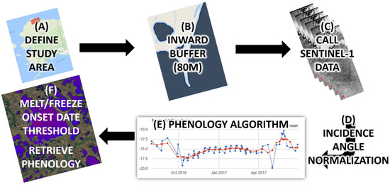 Flowchart of automated ice phenology retrieval using Sentinel-1 acquisitions within the Google Earth Engine coding environment. The steps within the processing chain are as follows: (A) a study area is defined using either a user-defined polygon or imported lake boundary. (B) An inward buffer of the polygon is generated at a distance of 80 m to avoid mixed pixel effects of backscatter from the lake edge. (C) Sentinel-1 acquisitions intersecting the boundary are called from the Sentinel-1 GRD GEE repository, where (D) an incidence angle normalization is applied as described by [60,61], and (E) a smooth algorithm is applied to the winter-time series of Sentinel-1 backscatter on a per pixel basis. (F) Once a drop in the smoothed backscatter is detected that exceeds a user-defined threshold, the date of the drop is recorded and flagged as freeze-onset, or melt-onset.