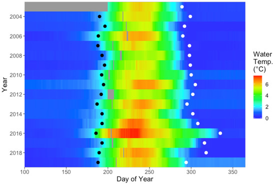 Considerable annual variability was observed in both mean lake water temperature throughout the summer and in the degree of water temperature stratification during the winter. However, a general increasing trend in lake temperature is evident in Figure 7, with warmer years clustered in the later portion of the time series. The mean water temperature from June–November (DOY 152–334) showed a significant increasing trend of 0.06 °C per year, according to a Theil–Sen line fit to the data (Mann–Kendall (M-K) trend test: p = 0.008). Additionally, the lake stayed warm for a longer period each year. The latest day with a mean temperature above 4 °C was found for each year, and significant increasing trend of 1 day per year was observed (Theil–Sen line; M-K test: p = 0.012). Similar significant trends were found for 3 °C and 2 °C. These findings are consistent with extensive literature that documents rapid Arctic warming in the past two decades [26,62].