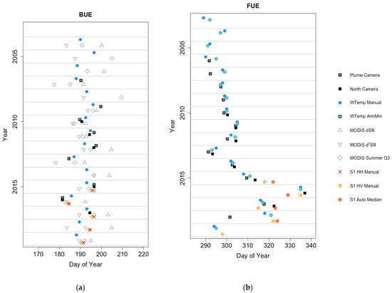 (a) Timing of BUE (x-axis) from the various in-situ and remote sensing methods in this analysis for each year in the study period (y-axis). (b) Same as (a), but for FUE. The dark, square markers indicate dates estimated from camera images, blue circular markers are estimates from water temperature dynamics, light gray markers are estimates from MODIS, and orange and red markers are estimates from Sentinel-1. The symbols are slightly offset on the vertical axis to reduce overlap. A trend toward later FUE is visible in (b), while no BUE trend is observed in (a).