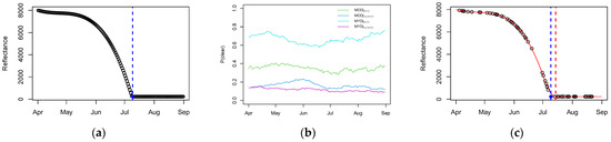 This Markov transition matrix was then used to randomly generate time series of cloudy vs. clear observations, which was applied to the idealized MODIS time series. For each cloudy observation, the value from the idealized times series was replaced with a missing value, resulting in a time series where the data were randomly knocked out due to simulated clouds (see Figure 9c). This process was repeated 1000 times, generating 1000 simulated times series of cloud-impacted MODIS observations. Then, a smoothing spline was independently fit to each simulated time series, using the same method that was used for the MODIS observations (Section 2.3.2), and BUE dates were calculated according to the MODIS “dSR” and “Summer Q3” methods (Section 2.3.2). These BUE dates were then averaged across all 1000 simulations of data loss due to cloud cover. Finally, the simulated BUE dates were compared to the “known” BUE date from the simulated time series (July 7 at 16:00 local time), in order to evaluate the uncertainty introduced into the MODIS BUE identification method due to cloud cover.