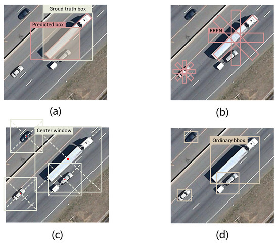 Of course, the above methods also promote the development of RS vehicle detection. Recently, a series of advanced vehicle detectors [27,28] place more emphasis on how to output high-quality rotated bounding boxes due to the flexible representation. Among these methods, detectors based on anchor and regression occupy the mainstream, and offer the representation of multi-oriented vehicles by a rotated bounding box (bbox) or quadrangles. Although these oriented detectors have achieved promising results, they still suffer from some fundamental problems. Specifically, in the anchor-based detector, if the vehicle has a large aspect ratio, some issues, as shown in Figure 1a, may occur when the anchor matches with the ground truth (GT). The intersection-over-union (IoU) between a detected predicted box and the ground truth box is large enough. However, it is unreasonable to define the detected predicted box as a positive sample, as it contains only a tiny amount of object information. If using this method to match the positive and negative samples, the performance and stability of the models will be seriously affected. RRPN [29] tries to solve this problem by introducing six angles for each generated anchor on the vanilla basis, as shown in Figure 1b. In this way, RRPN is more suitable for the oriented object detection task. However, it introduces multiple anchors, which leads to a large decrease in terms of speed. More seriously, these angle-guided distance-regression-based detectors suffer from two problems: (1) discontinuous regression values, which are directly caused by angular periodicity, and (2) the difficulty of regressing small vehicles. For small objects, even tiny regression deviations (height, width, or angle) can result in an object miss.