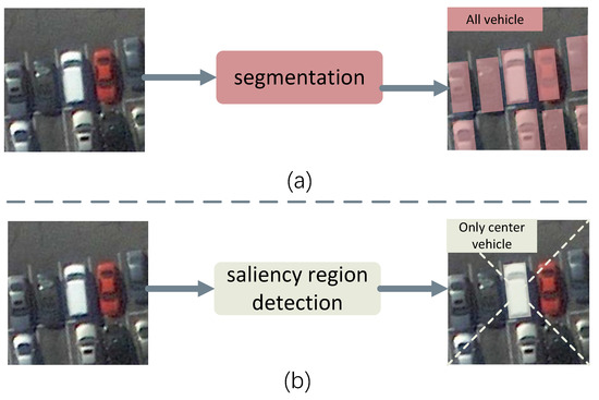 Difference between our saliency area (b) and binary segmentation (a). In our proposed SR-Net, we define only the vehicles at the center as the saliency area, i.e., the foreground. The saliency region is properly defined as the core of our SR-Net. Based on this definition, our results will not have the problem of sticking adjacent vehicle pixels. In contrast, the binary segmentation defines all vehicles as foreground.