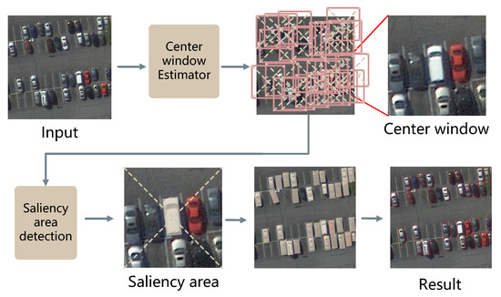 The pipeline of our algorithm. The center window estimator module obtains the center window of each vehicle. Then, the saliency region detection module detects the saliency region detection for each center window and decodes final predicted bboxes.