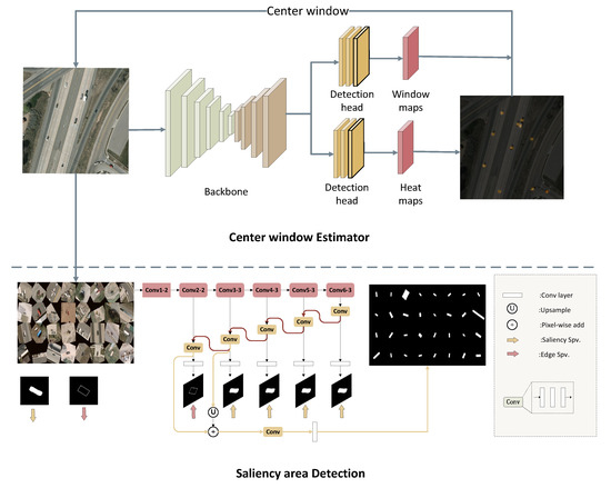 We first provide an overview of the approach. As shown in Figure 5, SR-Net consists of two modules, namely, the center window estimator module and the saliency region detection module. We first generated the center window on the center window estimator pipeline. With all of the center windows, we then introduced a saliency region detection algorithm to pursue a high-quality representation of the vehicle and decoded final predicted bboxes. In this section, we first introduce the detailed structure of the center window estimator module and the design of loss functions. Then, the saliency region detection module and edge capture module are introduced to generate the saliency region with high precision.