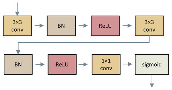 Schematic diagram of the structure of the detection head, where ”3 × 3 conv” represents a convolutional layer with a convolutional kernel size of 3 × 3, ”BN” represents the batch normalization layer, ”ReLU” represents the ReLU activation function, and “sigmoid” is the sigmoid activation layer.