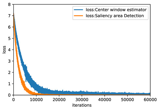 Training loss of SR-Net. The loss of saliency region detection has converged at 10,000 iterations. The loss of the center window estimator requires 60,000 iterations to fully converge.