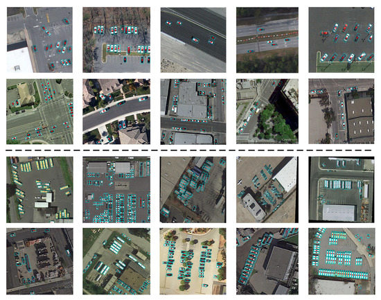 (4) VEDAI [42]: VEDAI contains two modal images, RGB and NIR, and four classes (car, pickup, truck, van), which, again, we still consider as one class. The dataset contains a total of 5494 vehicles, with a training set of 2792 and a test set of 2702.