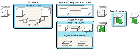 In this work, detection and semantic segmentation heads were placed on top of a 3D sparse convolutional backbone [104] in the U-Net shape [105], since this type of architecture previously achieved good results in regards to ALS point cloud classification and allows for direct 2D ablation studies.