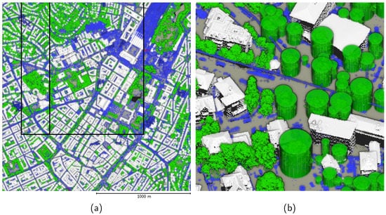 Urban trees are an essential part of cities’ green infrastructure and draw particular attention in city development and environment preservation. High and medium vegetation, e.g., trees and shrubs, have positive effects on urban quality of living. Ecosystem services provided by urban forests include, but are not limited to, a reduction of air pollution [1], an improvement of locale climate through shading and evapotranspiration [2,3,4,5], energy savings [6], and the enrichment of biodiversity [7].