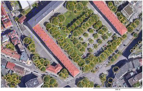 A municipal tree cadaster is a database in which only trees on public land are recorded, mainly in parks or along streets. The purpose of such inventories is mainly to ensure compliance with safety regulations [110] and general maintenance [8,11]. The present inventory had 207,248 entries for the entire city area, with the most recent entry dating back to 2014. Dedicated forest areas were excluded. Of these trees, 6150 were located in the core study area. However, besides horizontal coordinates, neither height, canopy width, nor similar size descriptors were noted, which are essential parameters in object-based tree recognition methods such as neural detection networks. Since this tree cadaster was spatially incomplete and lacked the necessary information to train and evaluate our network, it was manually enhanced, as will be described in the following section.