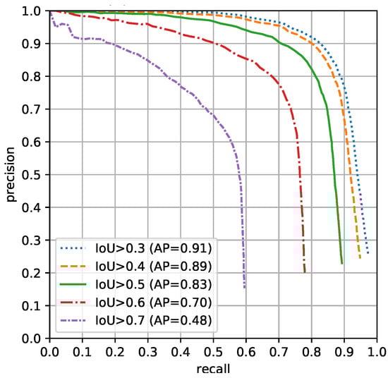 First, individual tree detection was evaluated in terms of pairwise 2D circular IoU overlap to the ground truth trees, accepting detections as true positives in regard to five different IoU thresholds. We computed continuous average precision (AP) from the interpolated precision–recall curve according to the Pascal VOC 2012 devkit, where further detections of the same ground truth were counted as false positives.