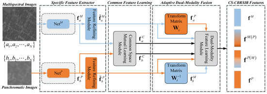 Framework of the proposed dual modality collaborative learning method. The multispectral and panchromatic images are first inputted into the specific feature extractor to extract their specific features and , and refined specific features and . Then, the common space features , can be generated by the common feature learning block using and . To fuse the information corresponding to different RS images and integrate the specific and common characteristics, , , , and are inputted in the adaptive dual-modality fusion block. Then, the fused features , , , and can be generated for the retrieval. The blue and orange streams illustrate the learning process of multispectral and panchromatic images, respectively.