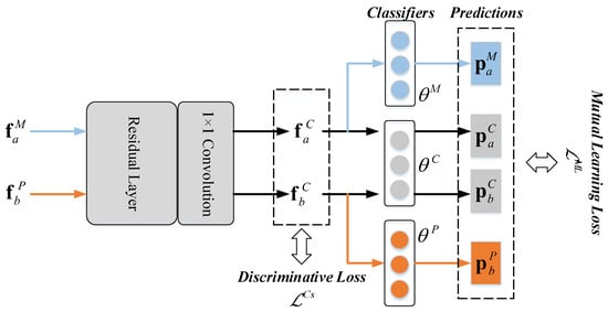 Furthermore, we develop the cross-source mutual learning loss to regularize the knowledge from different sources that can be transferred reciprocally. Consequently, the representation capacity of common features can be enhanced. Particularly, three classifiers, , , and , are embedded on the top of common space mutual learning module. Then, the predictions , , , and can be generated. Here, is the output of and , which implies the distributions of MSP images’ specific features in the common space. and are the products of , , and , which denote the distributions of common features corresponding to MSP and PAN images in the common space. is the output of and , which indicates the distributions of PAN images’ specific features in the common space. To ensure the diverse information can be exchanged mutually, we narrow down the difference between and , as well as the discrepancy between and . Thus, the cross-source mutual learning loss is formulated as: