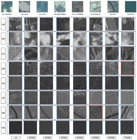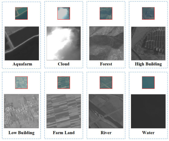In this paper, we select the DSRSID [51] to verify the proposed method. It comprises 80,000 MSP and PAN image pairs collected from GF-1 optical satellites. The sizes of MSP and PAN are and , and their spatial resolutions are 2 m and 8 m, respectively. MSP images have four spectral channels, while PAN images have single spectral channels. Each image pair covers the same ground region. Those image pairs are equally grouped into eight sematic classes, including “Aquafarm”, “Cloud”, “Forest”, “High Building”, “Low Building”, “Farm Land”, “River”, and “Water”. The samples of the DSRSID are shown in Figure 3. In the following experiments, we select 75,000 image pairs to train the proposed model, and the remaining 5000 pairs are regarded as queries.