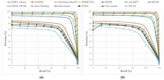 The results of different models are exhibited in Table 2, in which the means that users use MSP images as queries to find similar PAN images and indicates the opposing case. It is easy for us to find that our DMCL outperforms other methods in all cases. Particularly, for the task, the MAP enhancements obtained by DMCL are 1.17% (over ELKDN), 1.14% (over Distillation-Res50), 1.68% (over SIDHCNNs), 2.99% (over BDTR), 5.51% (over cm-SSFT), 5.71% (over BCTR), 16.02% (over TONE + HCML), 18.31% (over zero-padding), 19.62% (over one-stream), 20.61% (over TONE), 22.45% (over two-stream), and 25.48% (over DVAN). For the task, the MAP improvements achieved by DMCL are 0.87% (over ELKDN), 1.23% (over Distillation-Res50), 2.27% (over SIDHCNNs), 3.04% (over BDTR), 4.49% (over cm-SSFT), 7.08% (over BCTR), 16.05% (over TONE + HCML), 19.77% (over zero-padding), 21.58% (over one-stream), 21.81% (over TONE), 23.48% (over two-stream), and 26.60% (over DVAN). Such results are attributed to the following points: (i) the useful specific and common features can be fully extracted by the feature extractor and the common feature learning block, (ii) the obtained features can be fused well by the adaptive dual-modality fusion block, and (iii) both the specific and common features from different RS images are considered simultaneously during the retrieval process. In addition, we show the precision–recall curves of different methods in Figure 4. From observing these curves, we can further discover the superiority of DMCL.
