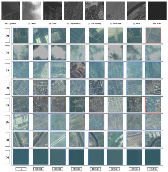 Visual retrieval results on cross-source . Inquiry images in the first row are from a panchromatic source and they are picked from each class respectively. (a–h) are retrieved images for the corresponding inquiry images in the first row. The red rectangles denote the false retrieved images that are irrelevant to inquiry images.