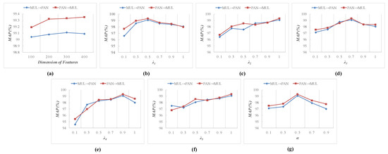 where denotes the feature of the MSP image in the MSP source, indicates the feature of the MSP image in the PAN source, and , , , and are the weights of different representations that can be learned by the simple fully connected layer. Similarly, for a PAN image , we can obtain its final features and according to the following fusion scheme: