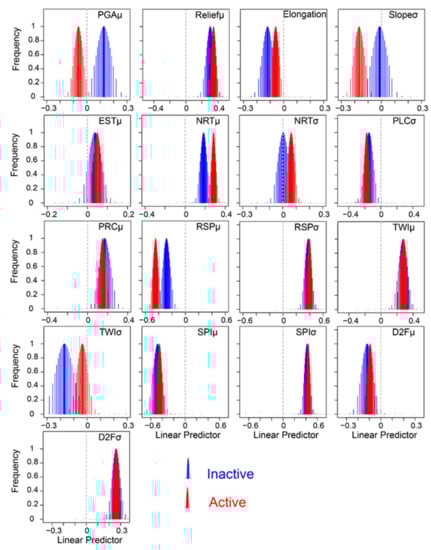 Fixed effects of geomorphological variables expressed as marginal distributions for inactive and active landslides.