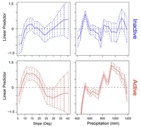 The behaviours of the nonlinear effects of covariates for inactive and active phenomena also are different, as shown in Figure 4. These nonlinear effects clearly point to distinct triggers for inactive and active landslides. In fact, for inactive landslides, neither slope nor precipitation exert significant effects (95% confidence level). For active landslides, positive effects are seen within a certain range of slope angles (10–20°) that could be related to specific materials capable of sustaining prolonged landslides, and for large amounts of annual precipitation (>800 mm/year), capable of frequently triggering or sustaining a variety of movements. On the contrary, in areas with less precipitation, the effect is slightly negative.