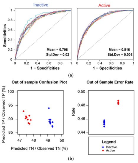 Figure 5a shows the ROC curves and their AUC values for ten cross-validations for the active and inactive landslide models. The AUC values (~0.8) can be deemed satisfactory and are consistent across the replicates, indicating robustness of the model []. The figure (bottom row) also shows the confusion plots of the two models, which are rather similar in both the high ability to detect true positive cases (~90%) and the lower ability to identify the true negative ones (47–50%). Consequently, the error rate (bottom right) is also of similar magnitude (44–50%), and it seems to fail on the stable conditions, together with the ratio between Predicted True Negatives and Observed Negatives.