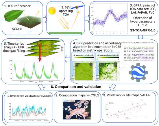 Figure 1 summarizes the proposed workflow and the following subsections describe all steps in detail. We start with the used RTM and the training data set generation (Section 2.1). Subsequently, the mathematical background of the GPR models is given (Section 2.2), followed by the vegetation traits mapping and time series analysis (Section 2.3). The specification of the TOA S3-OLCI imagery, provided by the GEE platform and the dedicated regions are detailed in Section 2.4. Finally, Section 2.5 introduces the validation data sets and corresponding processing strategies.