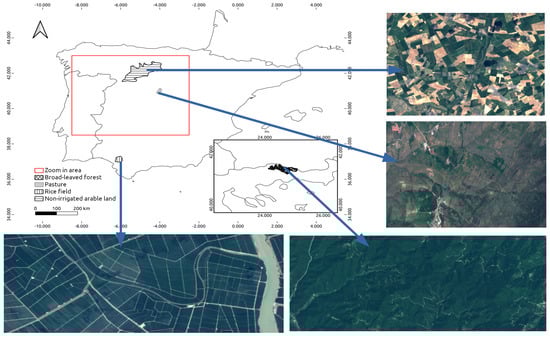CLC areas used for time series analysis. For more comprehensive insights, RGB captures were taken from Sentinel-2 scenes with GSD of 20 m, at different dates. Counterclockwise: rice field, broad-leaved forest, pasture land and non-irrigated arable land.