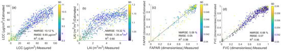 Theoretical validation of trait specific S3-TOA-GPR-1.0 retrieval models: LCC (a), LAI (b), FAPAR (c), and FVC (d) using the simulated SCOPE-6SV database (1750 samples).