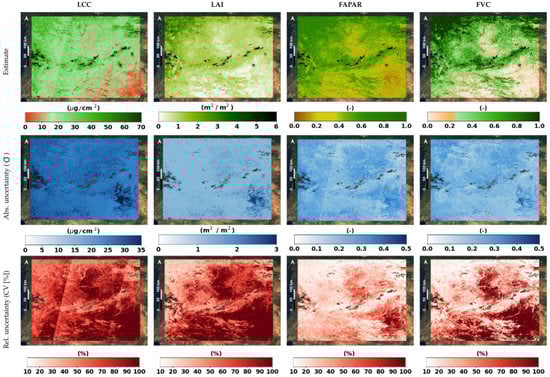 Figure 5 shows examples of daily estimation maps and associated uncertainties, obtained for a S3 capture on 20 June 2019 over a part of Spain and Portugal (red square in Figure 2). Values of FVC and FAPAR range between 0 and 1 for areas shifting from dry to temperate climates respectively [], with a corresponding uncertainty (1) generally lower than 0.15 provided by Equation (7) (see middle row of Figure 5). LCC and LAI estimates span between 0–70 μg/cm2 and 0–6 m2/m2, respectively, with maximum reaching around 35 μg/cm2 and 3 m2/m2. The maps in the bottom row of Figure 5 reflect the percentage deviation relative to the estimations, highlighting the areas with higher and lower reliable values. In this example, we detect the dark pixels in the South and center-top with maximum uncertainties for all the variables. Overall, the highest relative uncertainties are found associated to lower estimates, suggesting that the scarce or non-vegetated areas prevents our model from working in optimal conditions. Also, we find that FAPAR and FVC outperforms LCC and LAI models with generalized lower percentage deviations.