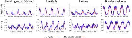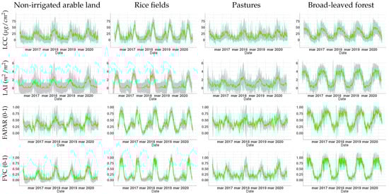 Our estimates captured the phenology associated to each land cover. Non-irrigated arable land and pastures, being more dependent on rainfall, reach biomass maturity during spring on this regions, according to the national phenological calendar for different crops []. Maximum vegetative peaks around May are observed for non-irrigated arable land and pastures. Rice fields usually fully grow during July and August on the analyzed sites. Broad-leaved forests presented maximum values of biomass over longer periods (during spring and summer). The temporal profiles also reflected larger for periods with lower vegetation values, e.g., LCC and LAI over non-irrigated arable land and rice fields presented larger shadows on non-vegetative periods, suggesting again that these models (especially LAI) face difficulties dealing with scarce vegetation or bare soils.