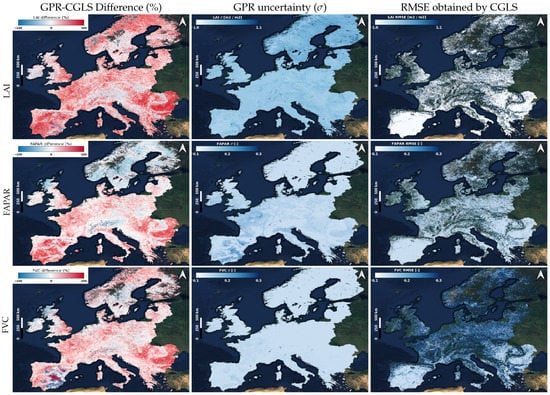 Comparison maps between CGLS and S3-TOA-GPR-1.0 models for a monthly averaged composed map between 4 March 2019 and 20 November 2019. In columns: maps of GPR-CGLS percentage differences (left), uncertainty () obtained by GPR (middle) and RMSE obtained by CGLS (right). In rows: maps of LAI (top), FAPAR (middle) and FVC (bottom).