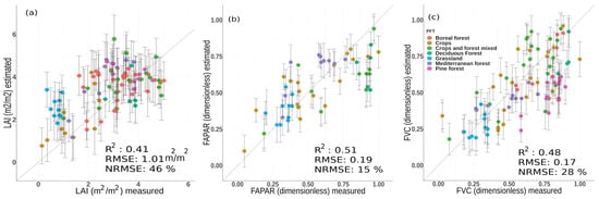 Scatter plots of predicted vegetation traits LAI (a), FAPAR (b) and FVC (c) by OLCI GPR models vs. interpolations based on ground measurements of the VALERI campaigns. The vertical bars show the obtained estimated uncertainty ().