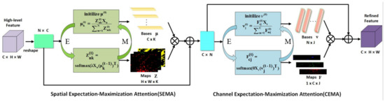- Li, X.; Zhong, Z.; Wu, J.; Yang, Y.; Lin, Z.; Liu, H. Expectation-Maximization Attention Networks for Semantic Segmentation. In Proceedings of the 2019 IEEE/CVF International Conference on Computer Vision (ICCV), Seoul, Korea, 27–28 October 2019; pp. 9166–9175. [Google Scholar]