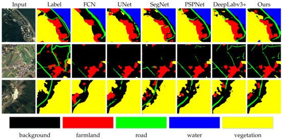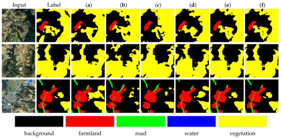Quantitative comparisons between other approaches and the proposed method on the Tianzhi testing dataset are conducted by metrics of OA and mIoU. In the TianZhi Cup dataset, the proportion of road elements is the lowest, so the minority categories extraction branch of the proposed network is mainly used to distinguish road elements. As shown in Table 2, the proposed method ranks first in OA and mIoU among six other classic methods and achieves 84.1% in OA and 68.1% in mIoU on the Tianzhi testing dataset. Meanwhile, the proposed method performs the best in categories of farmland and roads by a relatively large margin compared to other networks, which denotes the proposed method’s effectiveness, especially for the minority category. From Figure 4, it can be seen that our method achieves the best visualization effect, reflecting the consistency of the numerical results. In view of road element, the proposed method provides a more complete and accurate segmentation along the edge of the road. Meanwhile, misclassified pixels along the edge of objects take a smaller proportion.